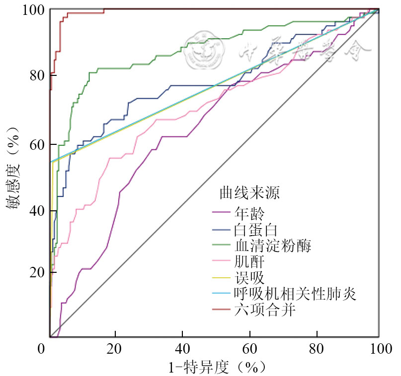 A total of 303 AOPP patients were included, among which 77 (25.4%) were complicated with ARDS. There were statistically significant differences between the two groups in terms of age (P<0.001), aspiration (P<0.001), ventilator-associated pneumonia (P<0.001), albumin (P<0.001), serum amylase (P<0.001), and creatinine (P<0.001). Multivariate Logistic regression showed that age, aspiration, ventilator-associated pneumonia, albumin, serum amylase, and creatinine were independent risk factors for ARDS in patients with AOPP. The area under the ROC curve for predicting ARDS in patients with AOPP by combining the six independent factors was 0.986 (95% confidence interval: 0.986-0.999).